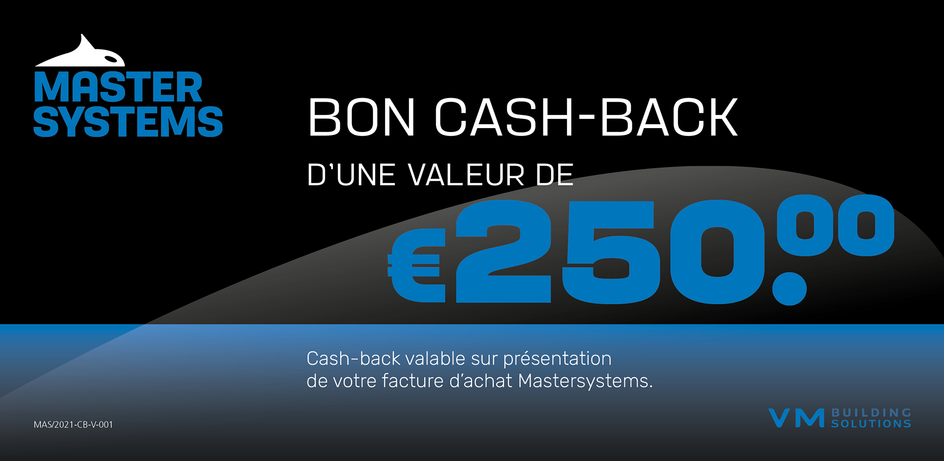 Toutefois, si vous prévoyez de suivre cette formation (démarrage chantier) dans les six mois suivant le deuxième niveau de formation, vous pourrez utiliser ce cashback de 250 €pour l’achat de produits Mastersystems.