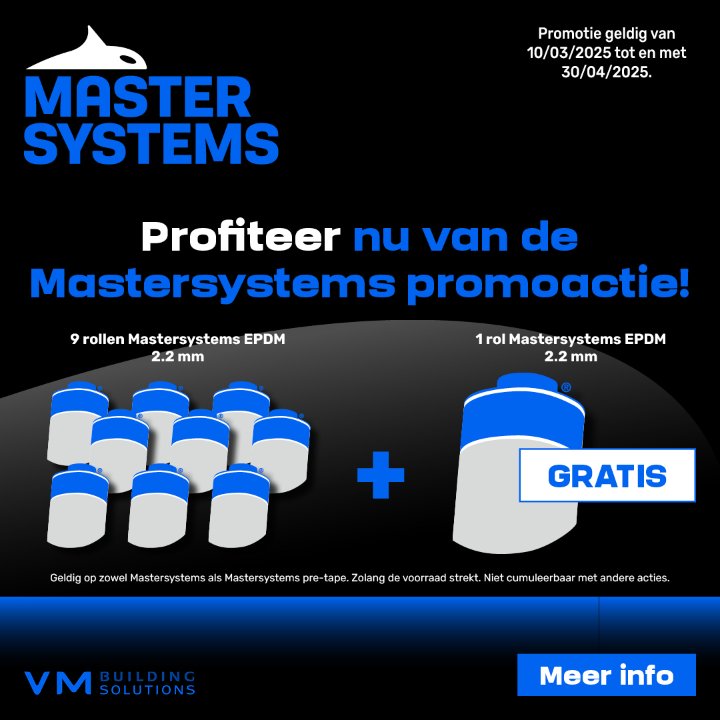 - Actie geldig op zowel Mastersystems EPDM 2,2 mm als Mastersystems pre-tape EPDM 2,2 mm (in beide formaten)
