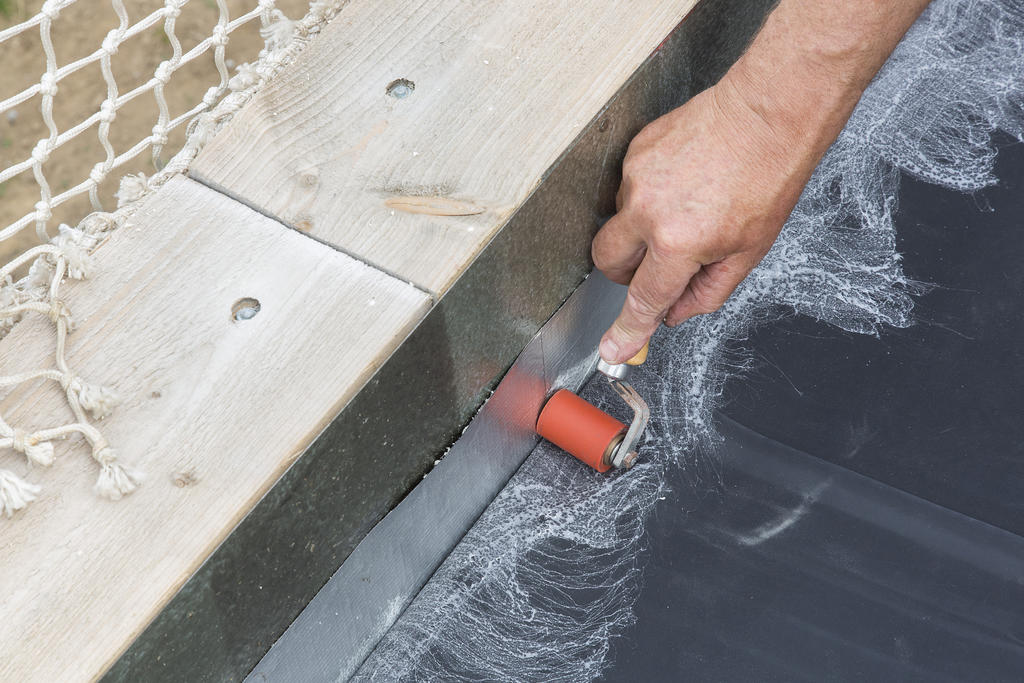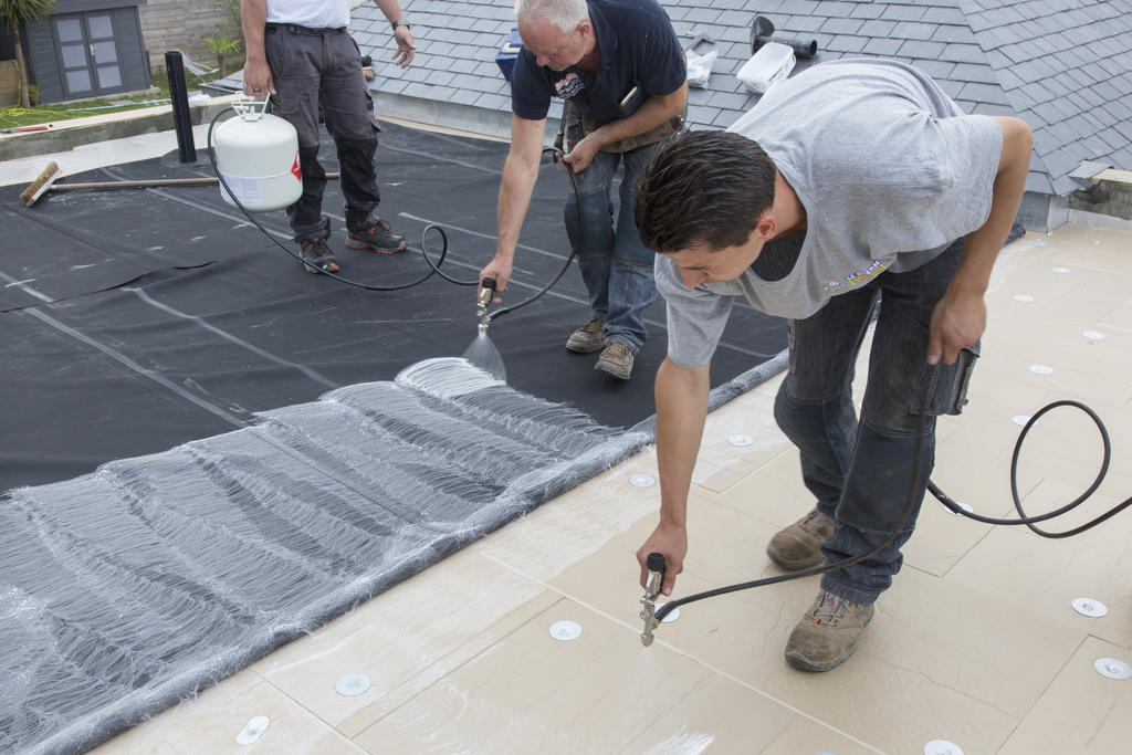 Een correcte installatie van Mastersystems is onmogelijk zonder het verlijmen van het dakvlak. Het kan met een borstel of lijmrol, maar een drukvat geeft het beste resultaat. Wanneer de lijm niet meer nat is en je bij stevig contact met de vingertoppen geen draden meer trekt, kan je het membraan op het dak kleven.